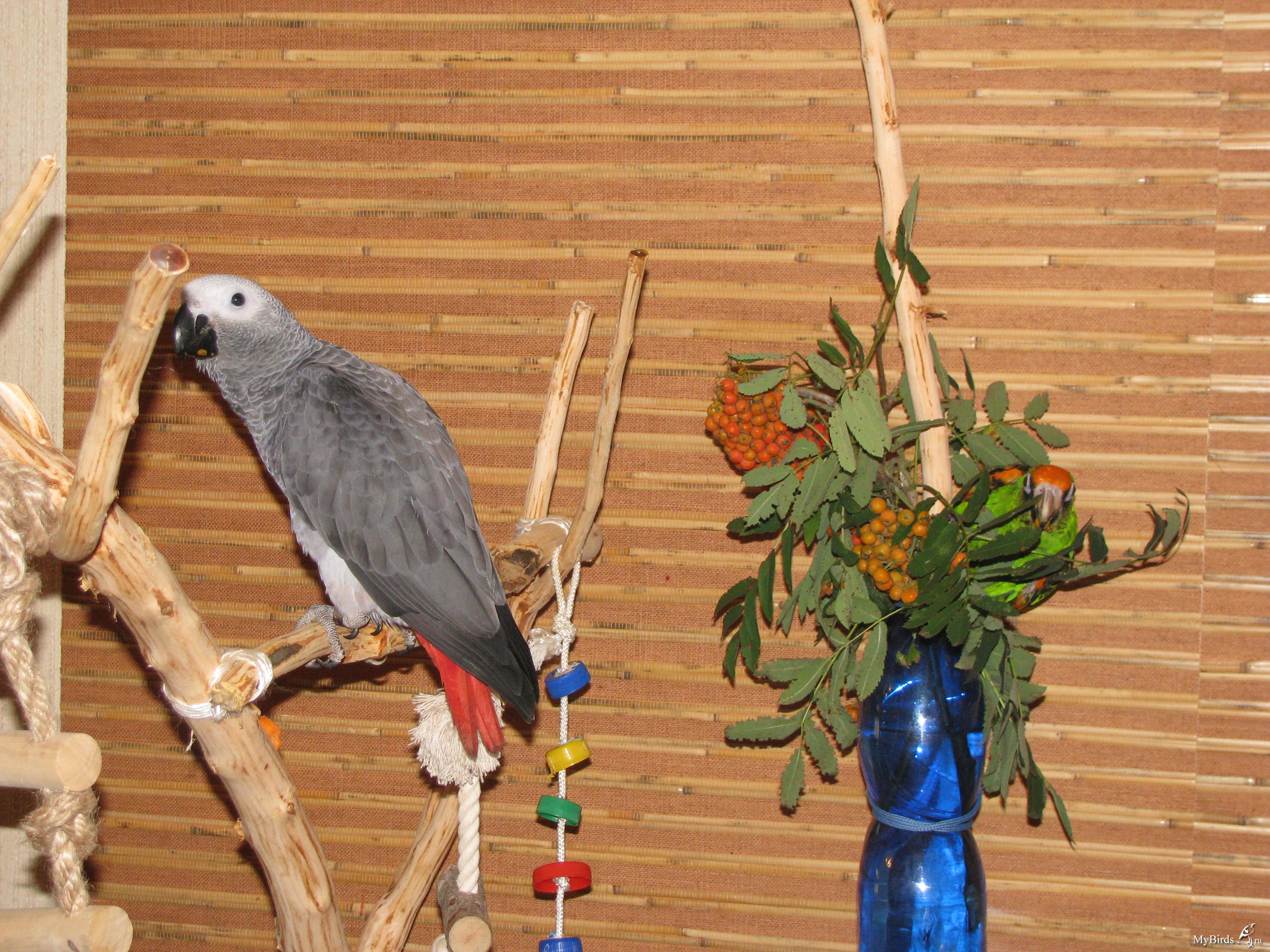 Перечитывая темы о любимых Жако, наткнулась на Отличнейшую идею привязать бутылочку с водой на стенд - и это так же оценили обе наши птички - от веток с рябиной их было не отогнать! А уставшая от постоянного ожидания своей очереди Чиппка умудрилась залезть с другой стороны и потихоньку, дабы Перец её не застукал, лакомиться.