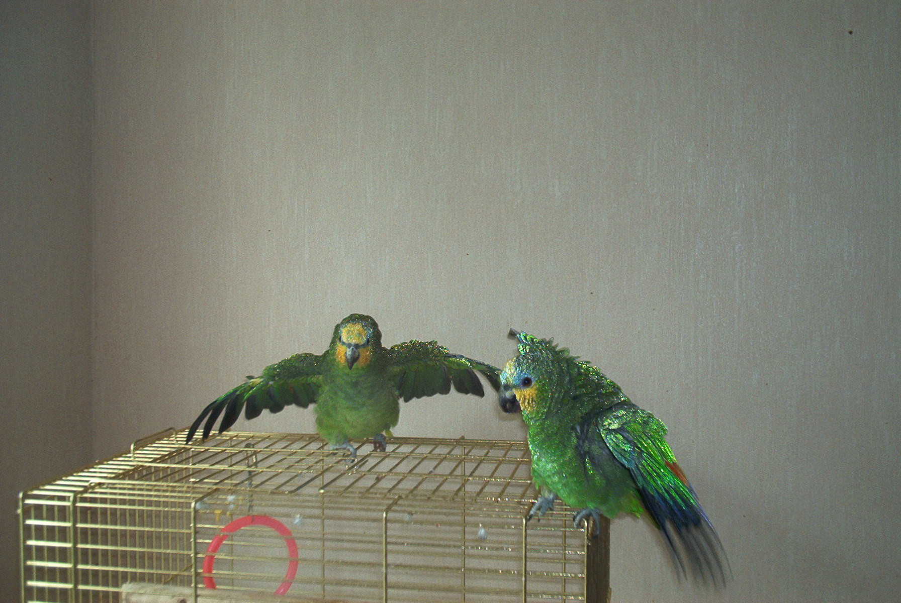 Второй закрылся крыльями во время "легкого дождика" из пульвилизатора. Но это от удовольския. Они это дело любят!