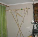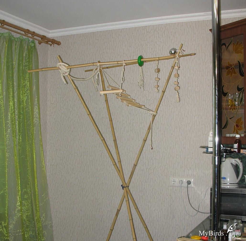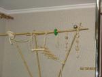 kan Опубликовано 25 октября, 2010 Автор #41 Опубликовано 25 октября, 2010 Поздравляю с красивой парой Здорово,что они так быстро подружились)) Спасибо Как и обещала, выкладываю фотографии своих поделок. это была идея мужа, сделать сненд из бамбука. Решили, что природный материал, к тому же ровный и легкий, все палочки разного диаметра для тренировки лапок. Пока повесили не все игрушки, решили пусть немного привыкнут к стенду. Осталось еще много заготовок для игрушек. Для себя выяснила, что электролобзик это ВЕЩЬ. Первая проверка на прочность. Чистим перышки на телевизоре.Вечером вдвоем сели на бамбук и стали засыпать, уже хотели их там оставить и не загонять в клетку, как они вдруг сами в нее залесли . Так, что спали они опять в клетки.