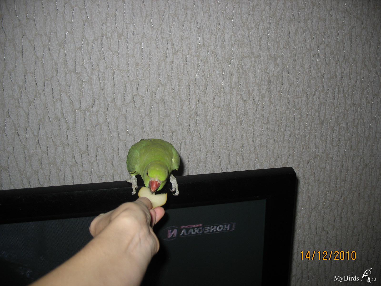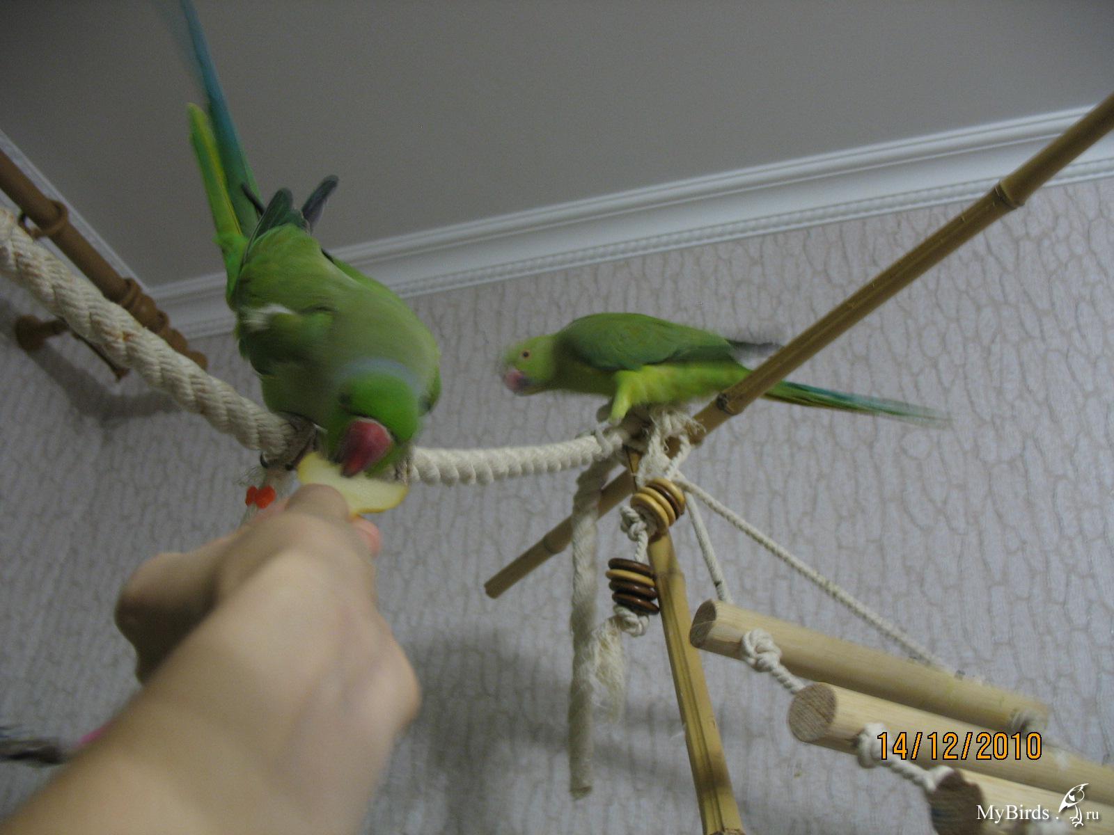 kan Опубликовано 11 ноября, 2010 Автор #76 Опубликовано 11 ноября, 2010 Наша девочка, радует меня все больше и больше. И кто сказал, что попугаи тигров не едят?! Петрович:-"Это мой диск, я в него смотрюсь" Леди:-"Как ты демаешь, он съедобен?"Как только я их выпускаю, они проказничают. Особенно любят достать новогодние игрушки, подняться повыше и скинуть ее вниз, ну если хозяйка все спрятала, то можно вытащить батарейки и их покидать со стола. Мне кажется, что наши соседи снизу от нас уже в ужасе, так как каждый день у нас то крик(это мы так радуемся под музыку из мультиков), то мы что то роняем. Кстати, теперь в клетку мы заходим так, вначале я заняю Петровича, благо он заходит как только я несколько раз включаю выключаю свет. Затем начинается, беготня по комнате в попытке загнать девочку. Если раньше можно было выключить свет и поймать ее, то теперь этот номер не проходит, она садится я выключаю свет, проходит 3 секунды и она поднимается к потолку , а я боясь как бы она не расшиблать бегу опять включать свет. Так что каждый вечер - это теперь как игра кто кого перехитрит. А Петрович, "предатель" сидит и молчит в клетке, даже голос не подает, чтобы девочку домой загнать