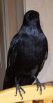 Жоржетта любит, чтобы я её гладил, ласкал и целовал. Периодически она отрывается от своих занятий и садится мне на руку, на колено или на стол, прямо передо мной, и требует, что бы я её погладил. Когда она садится на руку, то упирается клювиком мне в щёку или в нос и прикрывает глаза. Иногда при поглаживании ещё и тихо бурчит. Когда садится на колено, то упирается клювиком мне в живот. Обычно наши поглаживания длятся минут пять-десять, после чего Жо улетает по своим делам. Думаю, так Жо убеждается, что "папа" её (то есть принадлежит ей), что "папа" её любит. Она ведь ещё ребёнок и по вороньим меркам тоже. Ей всего два года. Ласкаю я её так: губами прихватываю её шейку и как бы её губами же прикусываю. При этом Жо вытягивает шейку и замирает. Целую её в головку и клювик, причём часто она сама требует, что бы я её поцеловал. Она вытягивает головку к моему лицу и "тюкает" клювом меня в губы.