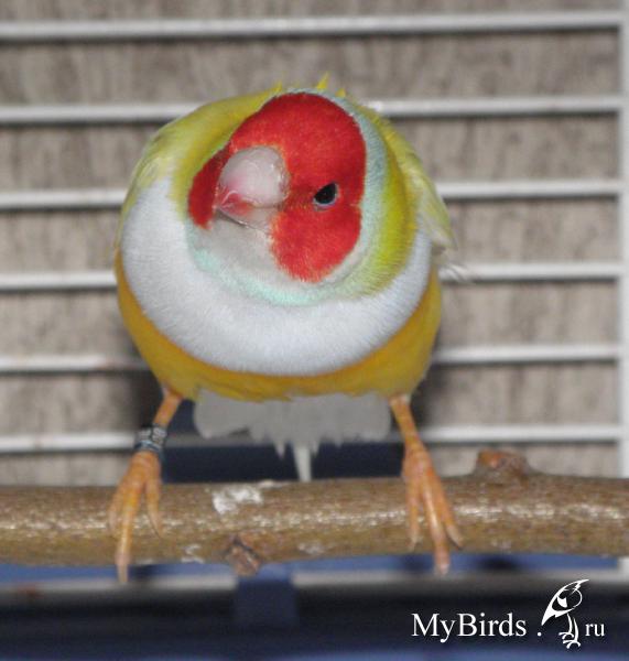 Fizalis Опубликовано 9 октября, 2011 Автор #92 Опубликовано 9 октября, 2011 Нежданчик. Зашла в зоомагазин за подаком коту подруги, а наткнулась на свежепривезенных гульдов. Пока стояла в очереди, ругала себя и говорила, что оно мне не нужно. Но первые слова на кассе были "забронируйте до воскресенья". И вот, теперь он дома - гульд желтой мутации. В магазине покусал продавщицу, а дома при обработке ивермектином меня. Хотела назвать Аурум (золото), но мама сказала, что он ей напоминает Белого Воротничка, а значит, зваться должен Нилом Кефри (в честь персонажа фильма Белый Воротничок). Маме я, конечно, уступила. Итак, знакомьтесь - Нил. Нил окольцован, колечко гласит E011
