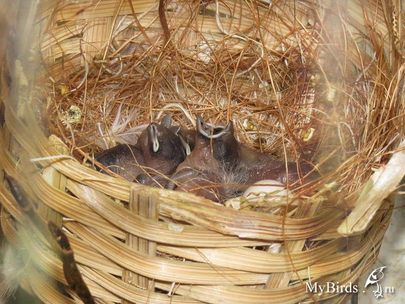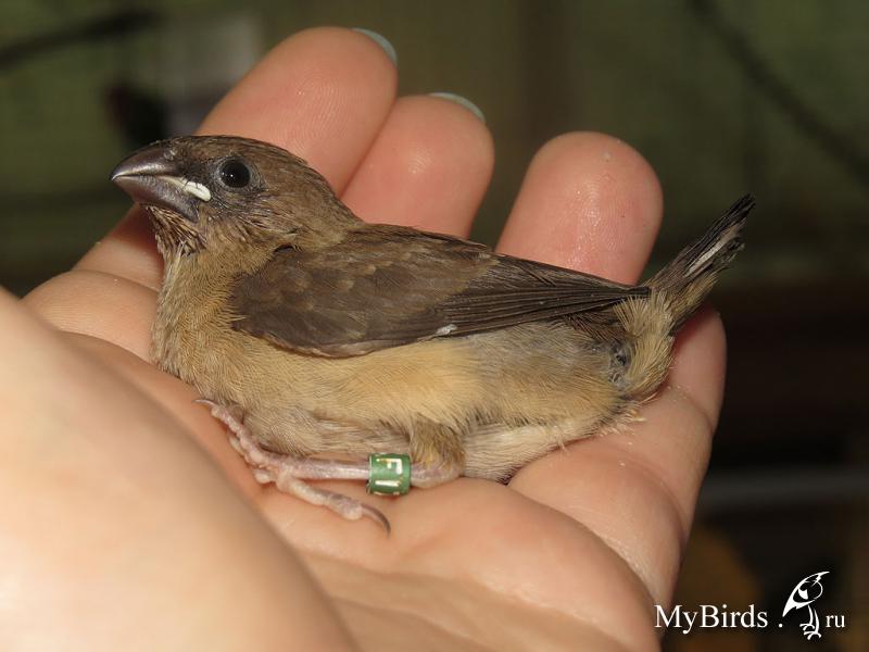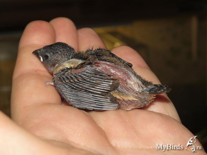 Fizalis Опубликовано 6 ноября, 2014 Автор #384 Опубликовано 6 ноября, 2014 У нас какая-то гадость.. Изначально думала, что трахейный клещ, и что легко вылечу, но птицы плохо отреагировали на лекарство (желтый помет, потеря веса). Несколько погибло. Думаю, что могла купить подделку или упаковка была повреждена и флакон испортился... В общем, пока что дело обстоит плохо, хотя, стабилизировалось. Но есть у меня один маленький лучик радости... Красноголовые попугайные амадины закапывали яйца, поэтому последняя их кладка была подложена японцам. На результат я не рассчитывала, потому что долго ждала, что КПА раскопают кладку и сядут на нее сами, но случилось чудо. Вывелись 2 малыша. Один перед вылетом отстал в развитии и погиб (вероятно, самка старше, чем мне было сказано, или она не очухалась после предыдущего хозяина, хоть и вылиняла у меня и на предыдущем месте не гнездилась). А вот второй уже кушает самостоятельно. Фотография не сегодняшняя, со 2ого чила.
