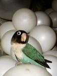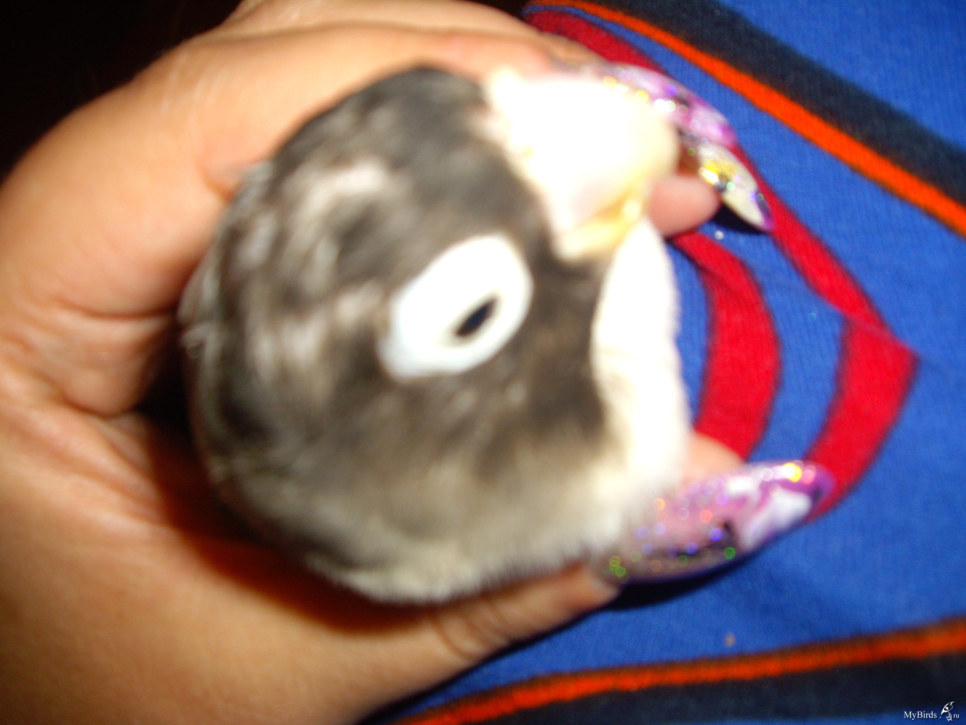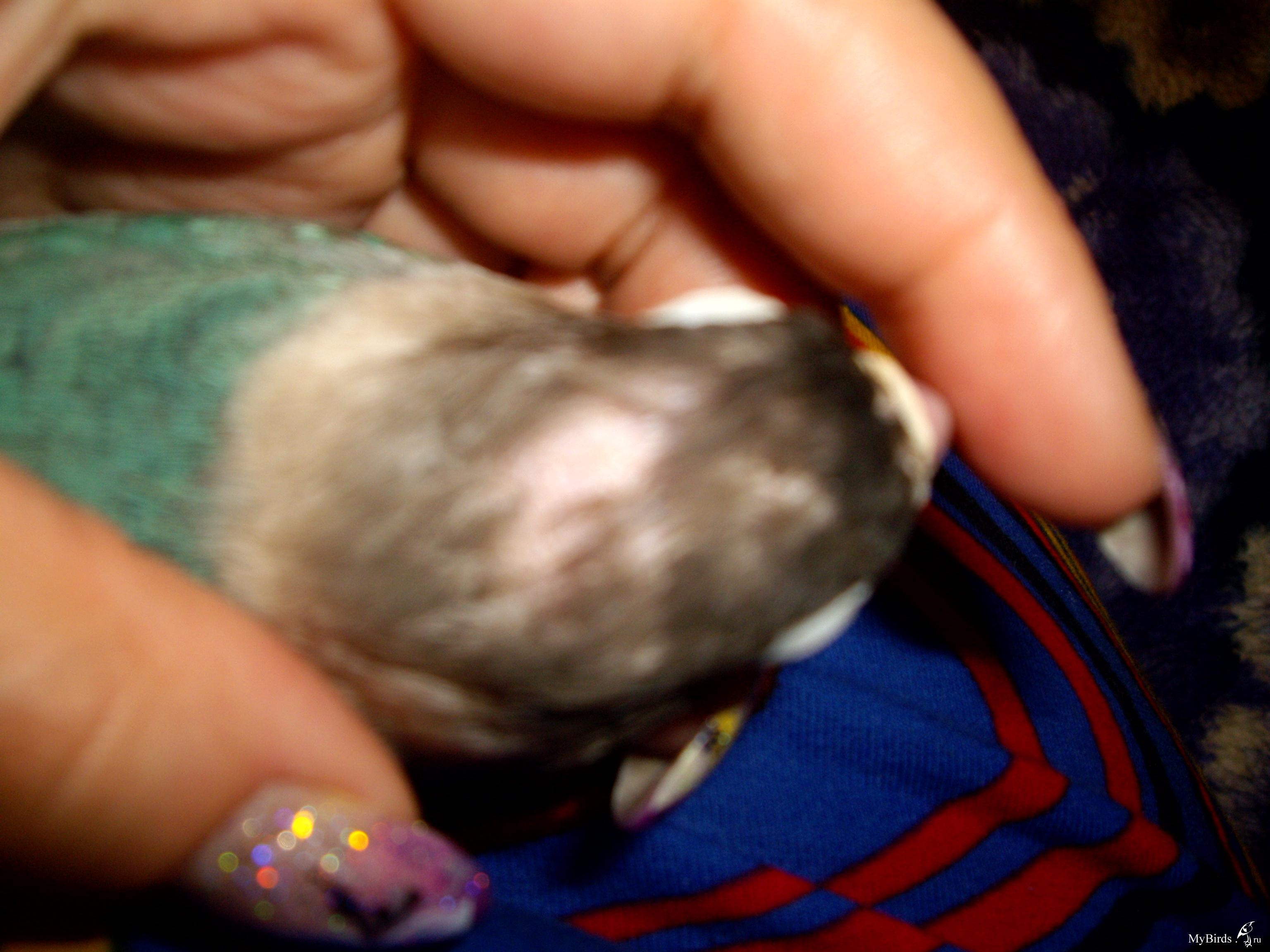 Моему второму птенчику всего 2,5 месяца,и чёрные пятнышки на клюве уже почти сошли!
