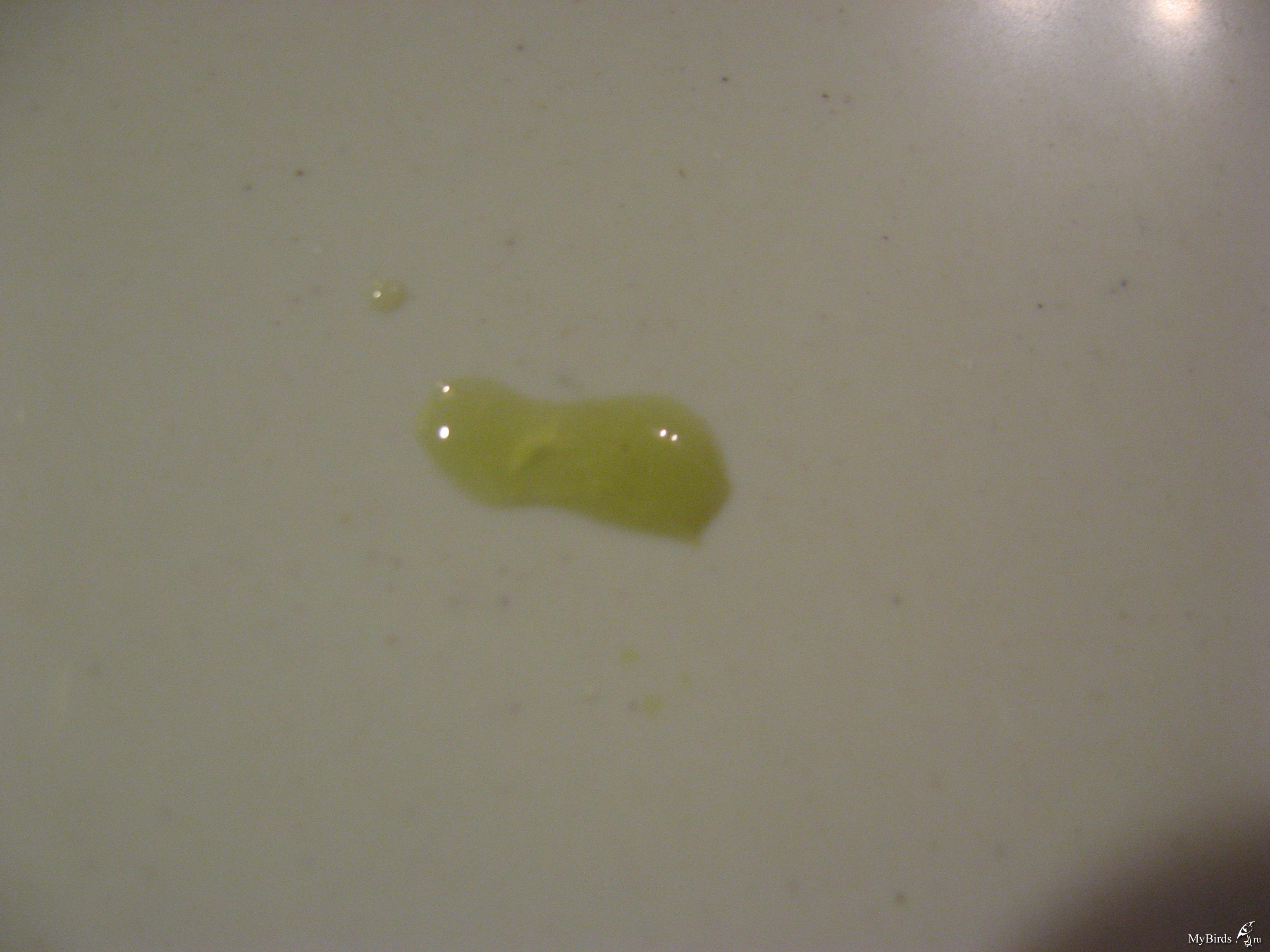 Вчера вечером у попугайчика был жидкий помет - не структурированный на белое и не белое, смешанный, + капельки прозрачной жидкости!!!! Что это такое? Сегодня утром обнаружила кучку на одном месте, такого же цвета и качества как и на наших фотографиях, вокруг - желтоватые пятна. Какую воду ему давать? Сейчас пьем "Майская хрустальная": общая минерализация 0,9г/дм.куб. Состав: гидрокарбонат - 450-600; катионы натрий+ - калий - 150-300. Природные фториды до 2,0мг/дм.куб. Можно нам такую? Можно ли ему давать что-нибудь кроме корма или подождать пока? Очень жду ответа как давать Линекс - по 1/4 капсулы на зерно каждый день?