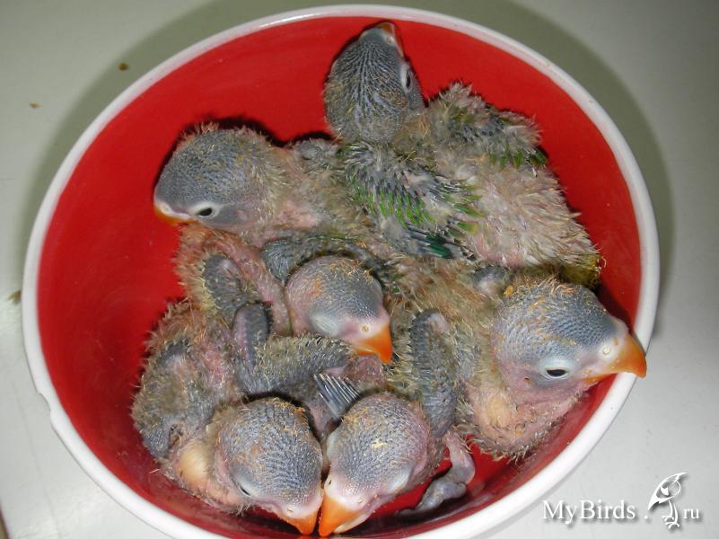 Вот только-что забрал птенцов от самки фишера и подложил к масковой зеленке, так как уже до крови "достригла" малышей(хотя зеленка тоже та еще "парикмахерша")