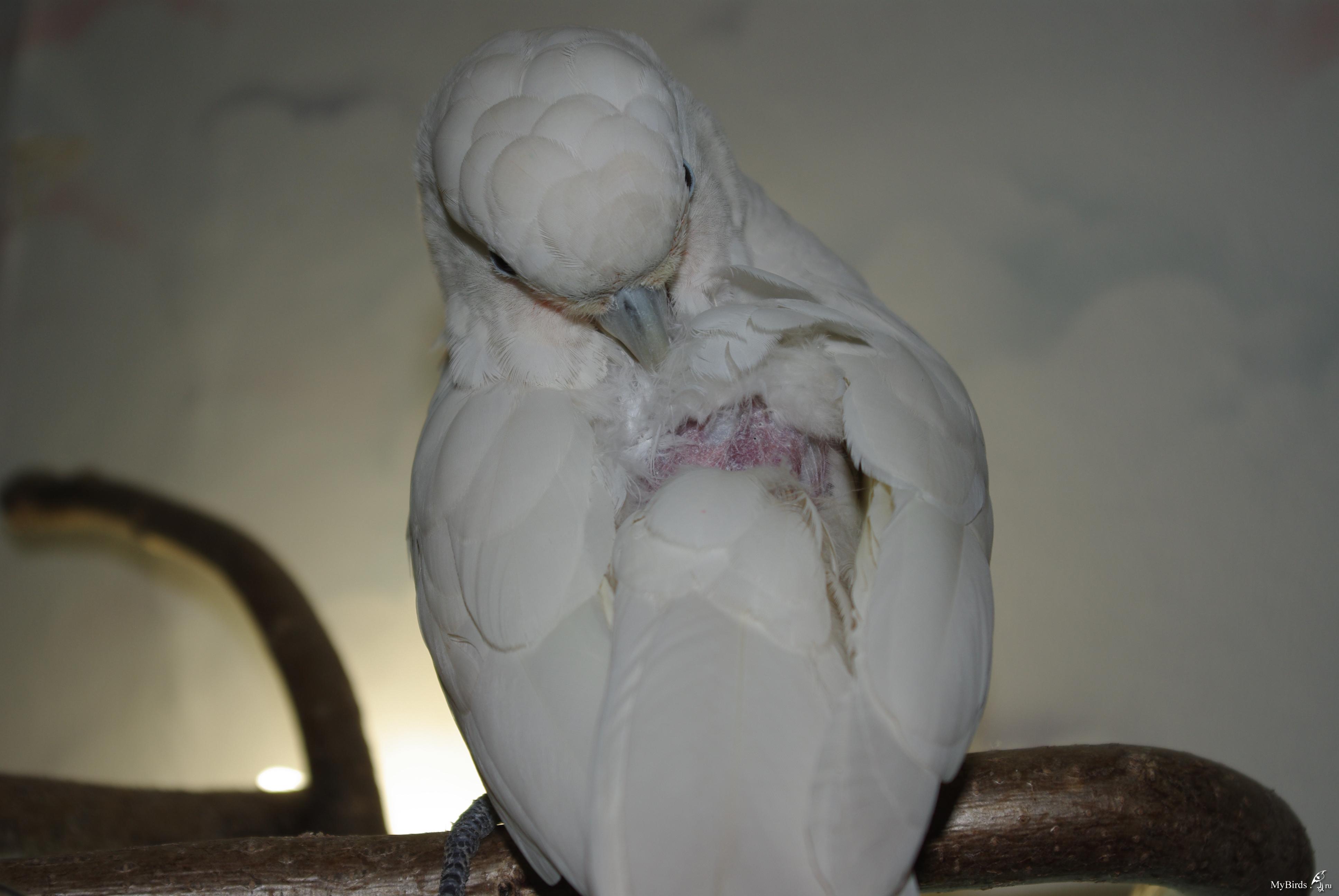 Radhi Опубликовано 31 марта, 2011 #1 Опубликовано 31 марта, 2011 1. Какаду Гоффина, Сурья, девочка, 6 лет, вот из этой темы.2.Рацион: Гранулированный корм Харрисон + ZuPreem, чайная ложка зернового (смесь из Престижа разных видов и немного Витакрафта), яблоки, груши, банан, тыква, кабачки, морковка, виноград и т.д. - из всего разнообразия пока налегает только на яблоки и бананы, остальное изредка. Как лакомство -кедровые орехи, в день 3-4, грецкие - редко маленький кусочек.Из витаминов и лекарств сейчас только карсил . 3. Световой день 12-13 часов, в комнате около 22 градусов - зависит от наличия солнца за окном, работает мойка воздуха и и ногда ультразвуковой увлажнитель. Влажность около 40-45%. 4. О беспокоящем.Птицу взяли немного ощипанную из-за одиночества и невнимания. Врач смотрел - И.Тимерин. Сдавали анализы - биохимию и т.д. Ничего особо страшного обнаружено не было, кроме некоторых проблем с печенью и показателей, указывающих на общую слабость организма.Последовательно проводилм лечение различными препаратами по совету врача, как то:кальций в поилку, цамакс, витамины Беафар- Маузер Тропфен, пробиотик Avipro Plus, Nepton. Постоянно карсил, сейчас шрот расторопши.За ощипом замечена никогда не была, но всегда много чесалась. Связывали это с тем, что растут перышки и кожа сухая. Образгивали вечером горячей водой из пульверизатора с добавлением "розовой воды с глицерином". Лапки и ножки (голые) по совету доктора смазывали мазью "спасатель" и "эплан".5. В последние пару месяцев чесаться стала активнее, ощущение, что это перешло у нее в навязчивую привычку. Чешется со всех сторон, но больше всего достается грудке, из-за чего и решила обратиться за помощью. Там образовалась сухая корочка с красными пятнами, понятно, что ее это беспопкоит и она постоянно ее теребит. Остальные места, которые чешет - спина, бока - кожа нормальная. Сейчас наблюдаю активный рост перьев (ттт), даже на ножках стали пробиваться перышки, много пуха по бокам и т.д. Но на злосчастном месте на груди все идет тяжело, потому как чешет не переставая. Пробовали брызгать ее водой с валерианкой - никакого результата. Доктор посоветовал мазать мазью(спасатель или эплан) это место - мажем, потом она целыми днями пытается снять с перьев остатки, чистит клюв и опять... Пробовала мазать аккуратно кисточкой между перьев, чтобы на них меньше попадало. Вроде чешется меньше, но для нее это мученье, потом приходится ее отмывать под душем - опять мучение... Не знаю, что еще придумать. Наверное, последовательно мазать каждый день нужно, но так жалко ее... И она уже на поросенка похожа... Или ей надо что-то успокоительное уже - слишком похоже на нервное((После душа выглядит нормально, но ненадолго. Фотки прилагаю.Очень жду помощи! И спасибо, что дочитали...