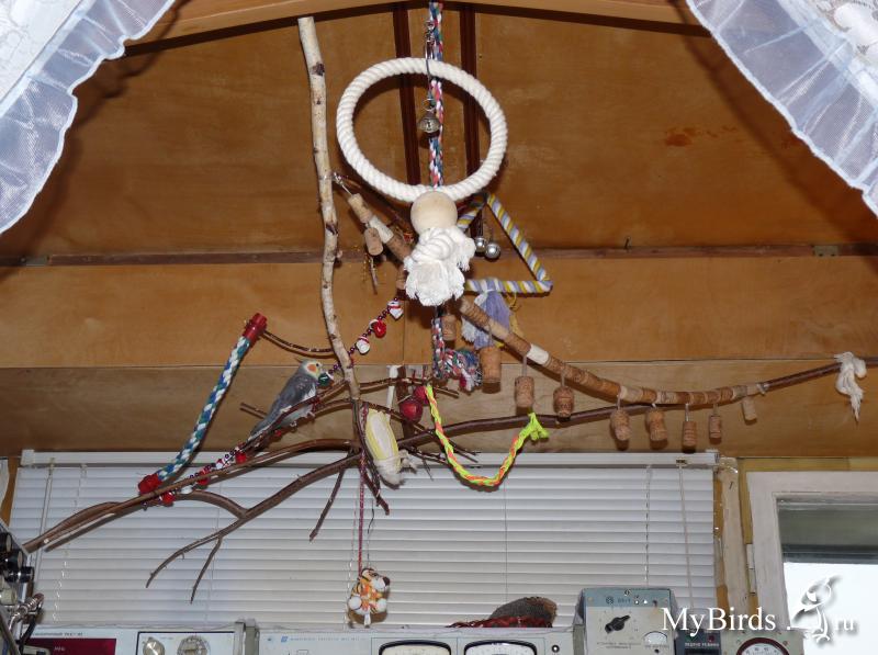 E52 Опубликовано 18 октября, 2012 Автор #19 Опубликовано 18 октября, 2012 Вот, решил показать Sniller, какие игровые стенды сделали для меня из того, что попалось под руку. Один прикрепили к домику, где я сплю, а второй расположили под потолком бывшей лоджии. Сперва, как я появился в доме, были только ветки, плюшевый тигрёнок и ёлочные бубенчики. Вскоре добавилась «ветка» из бутылочных пробок и «бусы» из пробок и колечек от пакетиков с соусом. Потом прицепили «верёвки» из магазина. На фотографиях показаны мои стенды в сегодняшнем виде. http://www.mybirds.ru/forums/style_emoticons/default/fly.gif