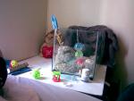 Xelen Опубликовано 20 августа, 2011 Автор #93 Опубликовано 20 августа, 2011 (изменено) Боки малыш дорос до (+ - пару дней) 2х месячного возраста, становится всё более любопытным и так как мы пока не купили клетку, а малыш в своей банке сидеть хочет всё меньше и меньше, я решила немного расширить его мирок. Уже с неделю помоему, он научился вылазить из домика по полотенцу, потом на мягкого ежа и ко мне на кровать или вокруг да около, но обратная дорога без моей помощи ему не удавалась , хотя он честно пытался. Я устроила на прикроватной тумбочке игровую площадку, чтоб не свалился в щели положила деревянный лист ( крашеный правда, но он не грызёт его) правильного размера, он оценил мою заботу. Ну и между делом покажу, какие мы молодцы и как мы кушаем кашу с овощами )) А сегодня я что то решила ещё больше облегчить ему жизнь, и дать возможность потренироваться на вскарабкиваниях всяких, поучиться сидеть на импровизированной присаде, в общем интересоваться , всем, до чего ему позволено дотянуться. И так как наш стеклянный дом маловат для махания крыльями, я сделала вот чего, сейчас только что. Это большая деревянная чаша надеюсь на время будет ему служить гнёздышком , из которого он вон прямо сейчас, радостно входит и выходт, рядом любимые ёж с собакой, игрушки, и я )) Если не забракуете идею, подусовершенствую ещё немного. ... Вот щас брякнулся с ежа на доску эту, испугался и побежал ко мне жаловаться и обниматься ,ежа буду фиксировать значит)) Что мне ещё нравится, так это то , что малыш не какает нигде кроме домика, если он играет за пределами , начинает ёрзать, я его сажу в "дом" , он делает дело, и всегда так мило смущается после этого )) и сейчас вот сам залез в эту чашу , какнул , и вылез дальше играть Как думаете, оставить пока так вот всё, ему явно нравится, посмотрю конечно как ночью спать будет, я всегда рядом. Потом эту чашу в клетку поставлю, террариум его не было бы смысла туда ставить , из него не удобно вылезать , а залезать и подавно. ... Ещё нюанс, в стеклянном терариуме был подогрев дна, а в чашке его нет, но в комнате по прежднему поддерживаем кондиционером температуру + 25 ( тут пока не жарко, весна ещё ) не будет мёрзнуть ? Я положила на дно полотенце махровое и буду прикрывать часть чашки на ночь , бортики не очень высокие, но он большую часть ночи лёжа спит пока. Изменено 20 августа, 2011 пользователем Xelen