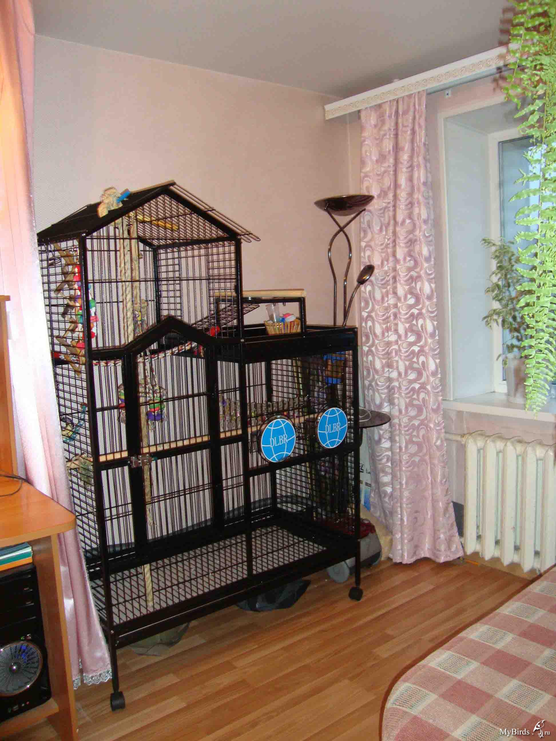 luchik Опубликовано 9 августа, 2011 Автор #43 Опубликовано 9 августа, 2011 Обещанный фотоотчет по Тимошкиной квартирке.Это китайская клетка, ехала к нам больше месяца. Нашла ее в китайском интернет-магазине, а заказывала через фирму, которая занимается поиском и доставкой товаров из Китая. Ожидали немного другой вариант. Заказывалась клетка в белом исполнении, а на рекламе была ядовито-голубая, но пришла черная. И присада должна была быть слева, а не справа. Длина клетки 114 см, глубина 57 см, а высота 166 см. Защиту от мусора ставить не стала. Есть задумка сделать защиту на нижнюю часть клетки из оргстекла.Тимошка ее уже обжил. Он с удовольствием находится в любом месте клетки. Наружу любит выходить через верхнюю дверку на присаду, а заходим мы на моей руке через переднюю дверку. Когда он жил в клетке поменьше, то любил, чтобы его накрывали. А вот в этой клетке он категорически против накрываний. Вот такую клетку мы заказывали. Вот такая клетка к нам пришла. Вот так она смотрится в интерьере. А это сам хозяин клетки. На этом месте он любит распеваться. Вот уже второй день нам такие рулады выдает! Мы просто не можем наслушаться.