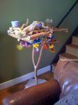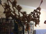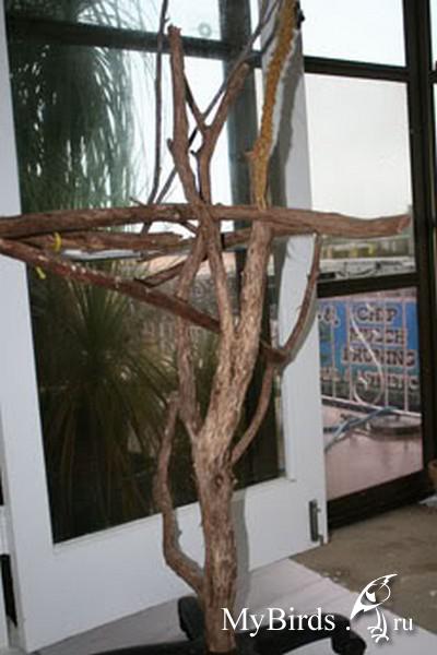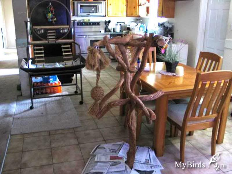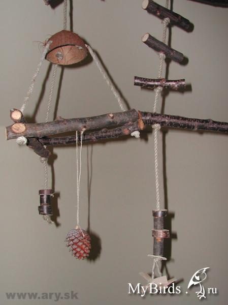 Irinkaa Опубликовано 28 октября, 2011 Автор #2 Опубликовано 28 октября, 2011 Подвесной стенд. Такой стенд имеет преимущества в том, что он мобильный - можно подвесить или переместить в любое место и то, что у него есть сетка-лоток, которая упрощает уход, т.к. весь помет и мусор летит не на пол, а аккуратно в эту сетку-лоток и подстилку в виде бумаги можно легко менять.Нужно необходимое количество толстых веток,саморезы, саморезы-крючки, цепь, карабин, пила, дрель, плоскогубцы и отвертка.После того, как вы скрепите верхний и нижний ярус стенда саморезами, можно прикрепить саморезы-крючки и цепи к ним для крепления к потолку и для крепления внизу сетки-корзины. Вместо сетки-лотка можно использовать любой подходящий лоток, главное, чтобы он подходил точно по размеру стенда. На верхнем ярусе ветвей можно прикрепить небольшие саморезы-крючки, на которые можно повесить игрушки. Материал и фото www.kaijuli.fi