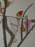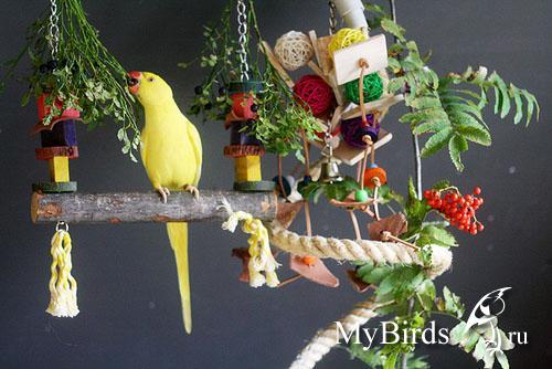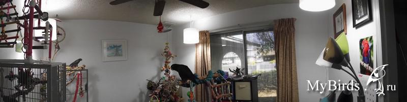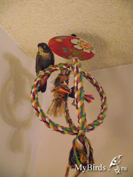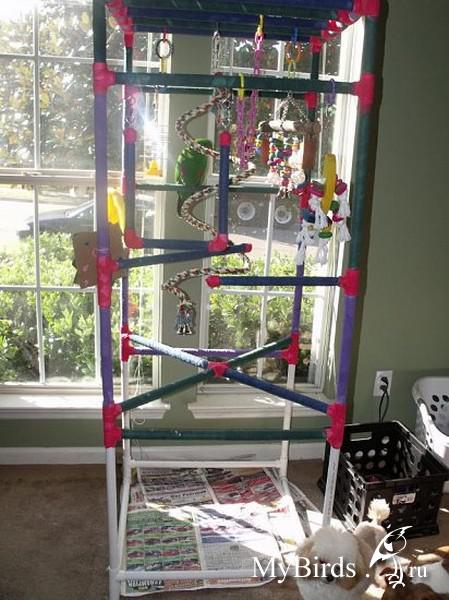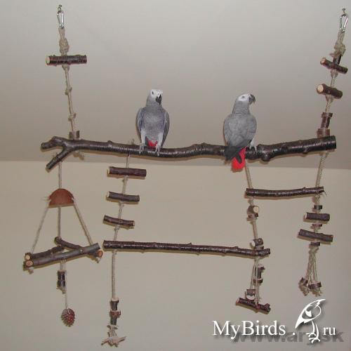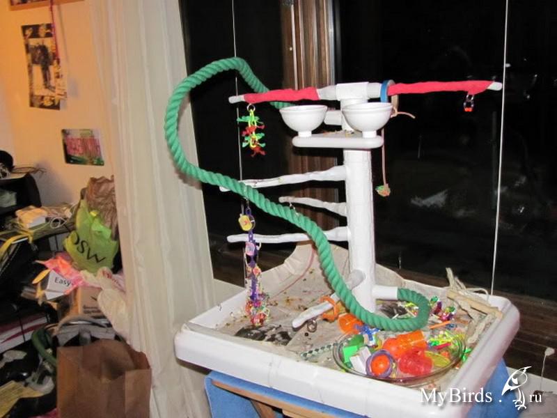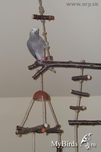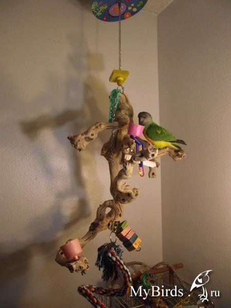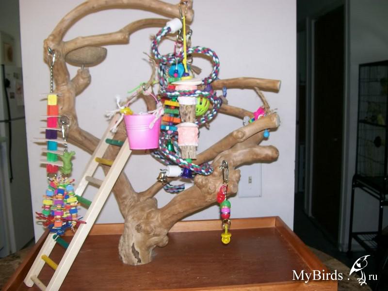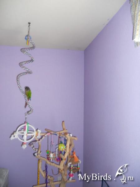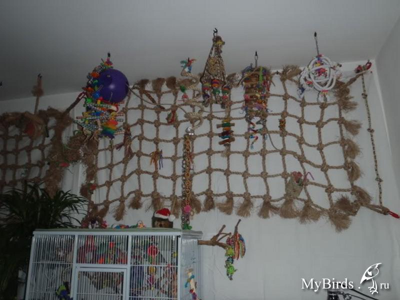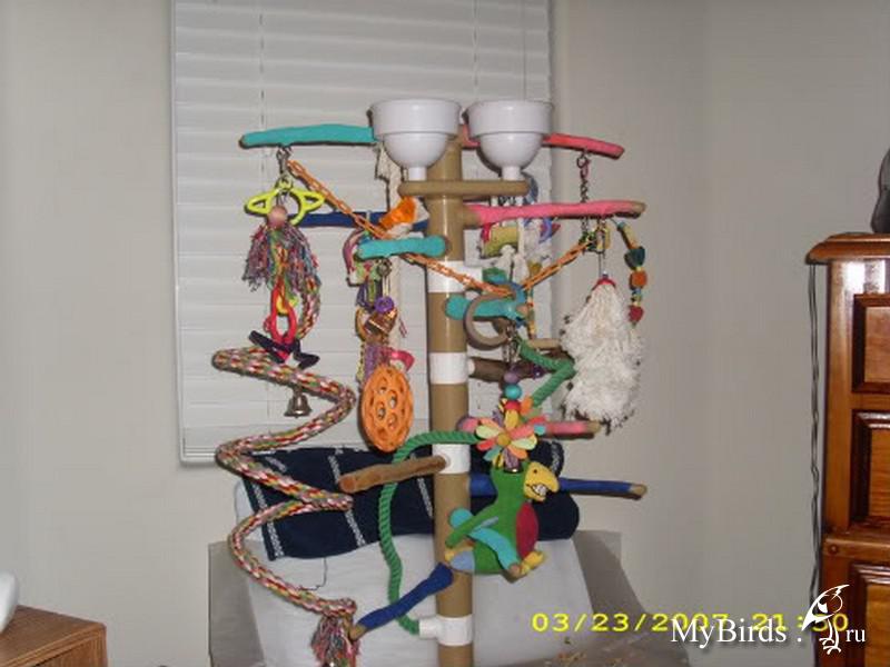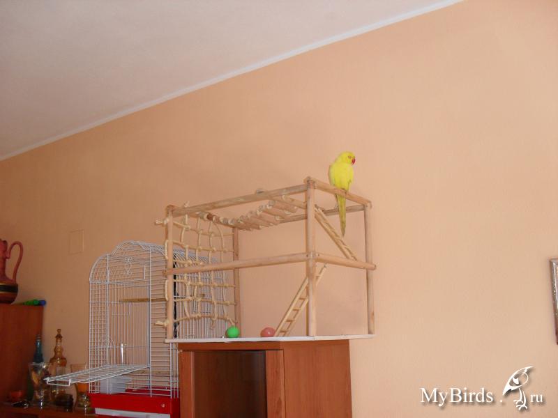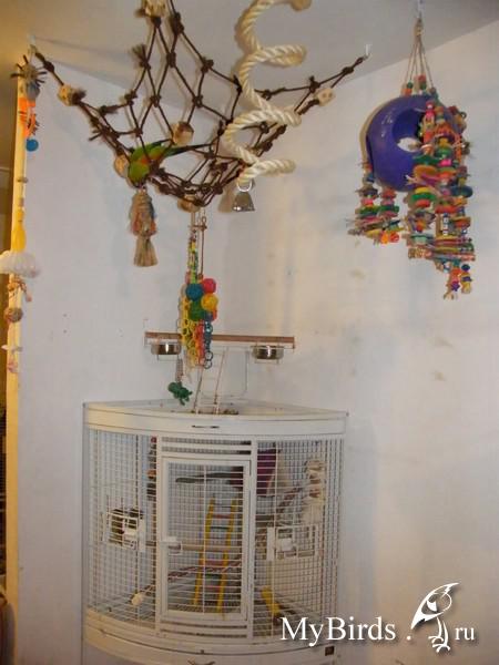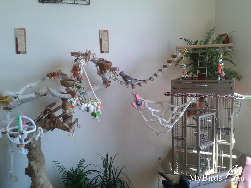 Irinkaa Опубликовано 4 октября, 2011 #1 Опубликовано 4 октября, 2011 Здесь представлен пример идеи и решение использования индивидуального пространства для попугая в комнате. Для обустройства игровой зоны было использовано свободное место 4мх1м. Идея заключалась в том, чтобы попугаи вне клетки находились в определенном месте и не проявляли интерес к другим местам в квартире. В противном случае, при отсутствии стенда или индивидуального места для попугая, есть риск и большая вероятность, что попугай может испортить и уничтожить любые предметы в доме.Цель индивидуальной зоны - предоставление интересного, наполненного места в среде, которая окружает попугая. Нет необходимости создавать в доме джунгли, намного важнее попытаться обеспечить среду, которая в полной мере позволит попугаю проявлять все то, что заложено в нем природой.Данный пример индивидуальной зоны не означает, что нужно использовать такие же игрушки, стенды и аксессуары, а даст вам идеи и вдохновение, которые можно применить, исходя из конкретного места и ваших возможностей.№1 - самый большой стенд на бетонированной подставке, на котором большое количество разнообразных веток для лазанья и не только( общий вес около 40 кг).№2 - небольшой по величине стенд и другой способ установки стенда - на подставку для установки новогодней елки, но следует учесть, что такой стенд очень не устойчив и его нужно укреплять какими-то тяжелыми камнями, к тому же подставка дополнительно была прикреплена болтами к дереву.№3 - стенд мобильный для лазанья из обработанной древесины. Такой стенд можно перемещать из одного места в любое другое, в основании стенда короб, в поддон которого можно поместить материал - подстилку( древесный наполнитель) для содержания в места в чистоте.№4 - винтовая лестница для лазанья от пола до потолка. Позволяет попугаю подняться до уровня дивана и проводить время вместе с вами в минуты вашего отдыха.№5 - деревянная толстая ветка -жердь, проходит через большую часть комнаты на высоте более 2м 10см, так что можно не беспокоится ударится своей головой при проходе. Концы жерди крепятся к стене широким металлическими уголками. Такая толстая ветка-жердь с корой служит для естественного стачивания когтей, когда попугай ходит по ней. К такой толстой ветки легко прикрепить разнообразные дополнительные ветки и нужно также прикрепить лестницу, как соединяющий элемент ветки-жерди и стенда.№6 - веревочная лестница. Соединяет дерево и винтовой стенд, прикреплена к винтовому стенду тонкими саморезами.№7 - игрушка башня для лазанья. Прикреплена к потолку крючком, инструкция по изготовлению http://www.mybirds.ru/forums/index.php?showtopic=82668№8 - игрушка-сеть для лазанья. В этой игрушке можно закрепит, например, половинки грецкого ореха, инструкция по изготовлению http://www.mybirds.ru/forums/index.php?showtopic=82668№9 - короб из досок, ограничивающий нижнее пространство игровой зоны, в основании лежит пластиковый коврик, поверх которого насыпан древесный наполнитель, что позволяет держать в чистоте загрязненные участки.№10 - лампы дневного спектра. В клетках могут быть использованы специальные лампы для птиц(UV-лампы), а в освещение комнаты лучше использовать дополнительно лампы дневного спектра, так намного светлее.Дополнение. Важно, что все части этой игровой зоны( стенды, ветка-жердь и лестницы соединены между собой, образ