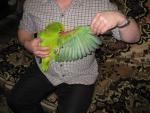 Elena1263 Опубликовано 21 марта, 2012 Автор #51 Опубликовано 21 марта, 2012 После карантина их клетки я поставила рядом, у птиц появилась возможность получше рассмотреть друг друга и привыкнуть к новым соседям! Тима, по интеллекту – маленький ребенок 2-3 лет. И как любой ребенок, очень любит игрушки! Когда он увидел изобилие игрушек у Клары, то при первой возможности он их резко уполовинил! Все что у Клары висело годами, еще со времен их совместного проживания с волнистиком, Тима разобрал в полчаса! Сколько при этом было счастья на его мордашке, нужно было видеть! Так, благодаря маленькому мальчику, у Клары обновился интерьер в клетке, и появились новые игрушки! Впервые месяцы Тима хоть и был ручным мальчиком, но брать себя в руки не разрешал, как говорится, «был начеку!» Он если хотел, мог сам подлететь и сесть на плечо, на руку. Брал из рук корм и лакомства. Давал одну лапку, вторую, позволял погладить носик, спокойно наблюдал, когда я чистила его клетку, или меняла корм. Мог разрешить почесать ему шейку и иногда сам подставлял голову, но как только рука пыталась перейти на спинку, он тут же убегал. Он сразу выбрал меня в свои «любимчики», и мне позволялось намного больше так называемых вольностей, чем другим домочадцем! Ну очень хотелось его погладить по спинке, я понимала, что добиться этого можно только запасаясь терпением, и тогда, когда он научится полностью нам доверять! Сначала они с Кларой жили, достаточно дружно, позволяли друг другу садиться на свои клетки. Правда, очень ревновал, когда Клара садилась ко мне на плечо, и при первой возможности всегда старался ее согнать. Это притом, что крылья у него были подрезаны, еще от прежних хозяев, и летать он толком не мог! Ужасно ему не нравилось оставаться одному в комнате, при любом возможном случае, он старался приземлиться ко мне на плечо, а если это не получалось, слетал на пол и отправлялся пешком!