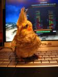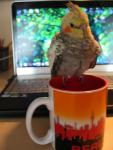 Любит ковырять клавиши на клавиатуре и гоняться за моими пальцами. Свободно летает по комнате и возвращается в свою клетку, садится на жердочку.