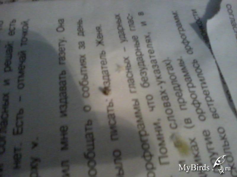 Valiushka55 Опубликовано 10 октября, 2012 #24 Опубликовано 10 октября, 2012 Вот сегодняшний помет: Клюв при свете дня Сегодня с дыханием лучше, иногда чирикает, лапки не синие. Вид все равно вялый. Помет более-менее. Раз с дыханием получше, то попоите пока боярышником. Он и от сердечка, и слабый иммуностимулятор. На ночь наливайте чистую воду(не из-под крана, конечно). Но за птичкой наблюдайте, поручите сыну, пусть записывает изменения в поведении попугая. А муж что, не сможет в поилку наливать уже заваренный боярышник и менять его раз в день? Поручите сыну тогда. Если на них надежды мало, то пусть хотя бы кормят и меняют воду в поилке.