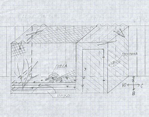 Альбина Опубликовано 12 июня, 2006 Автор #8 Опубликовано 12 июня, 2006 (изменено) Ярослава, я несколько раз пробовала фотографировать своих птиц в вольере, на обычный аппарат, цифрового нет, но довольно быстро от этого отказалась. Там очень трудно выбрать положение, чтобы солнце освещало птиц но не падало на объектив, поэтому получается нечетко.Вот несколько фотографий. Первая – южный левый угол, вот как раз за этой сосновой веткой коноплянка себе гнездо соорудила.Вторая – южный правый угол, пыталась сфотографировать как конопель кормит свою пухлявую ))) Третья – южный левый угол, кустик, с которого подлый урагус все почки обглодал, а в прошлом году такой зелененький был, цвел. Четвертая – южный правый угол, коноплян и урагус. Принесла зеленые веточки из парка, через пару часов стали такими же как кустик ))) зверствовали всей компанией, в ход пошли и листья и цветы.Вольер простой, соорудили как говорится из того что было под рукой, собрали остатки стройматериала. Размер 3,5х2 м, высота 2м. Вот попыталась примерно нарисовать.Западной стенкой служит забор, северная часть и область двери заделана ДВП. Крыша частично покрыта шифером. Стены и потолок по внешнему краю затянуты металлической сеткой, по внутреннему – мягкой форночной, это чтобы кошки не зацепили, они часто бросаются пытаясь схватить напуганных птиц, да и ячеи у внешней сетки крупноваты. Кормушку пришлось сделать повыше на стене, поскольку мыши повадились ходить. Так же есть пруд и горка из камней, на ней любит варакушка сидеть. Вот такое жилище. Изменено 12 июня, 2006 пользователем Альбина