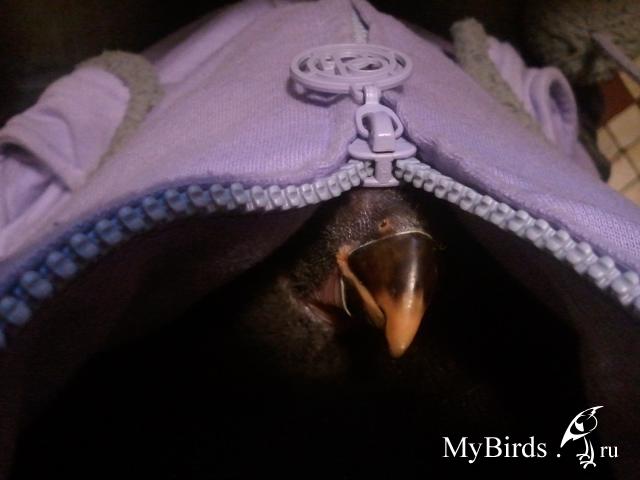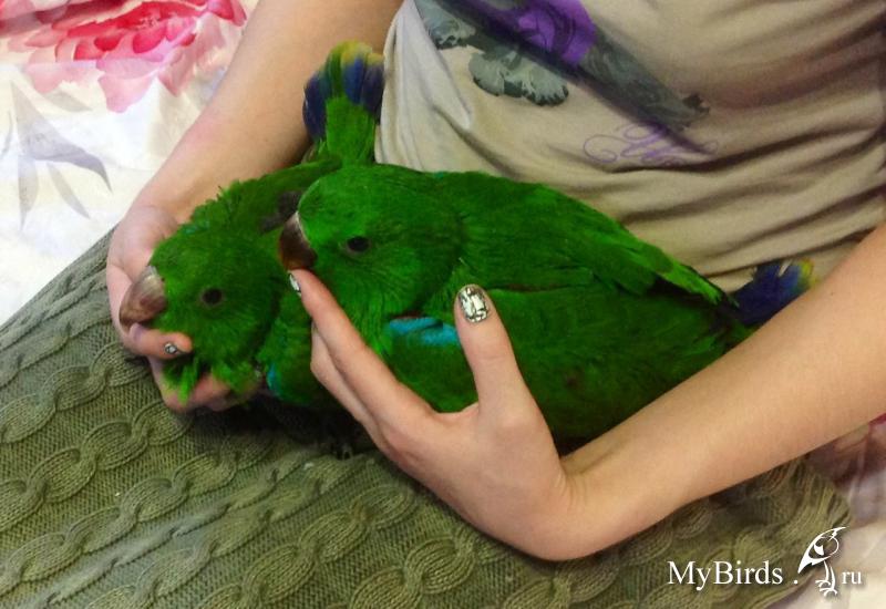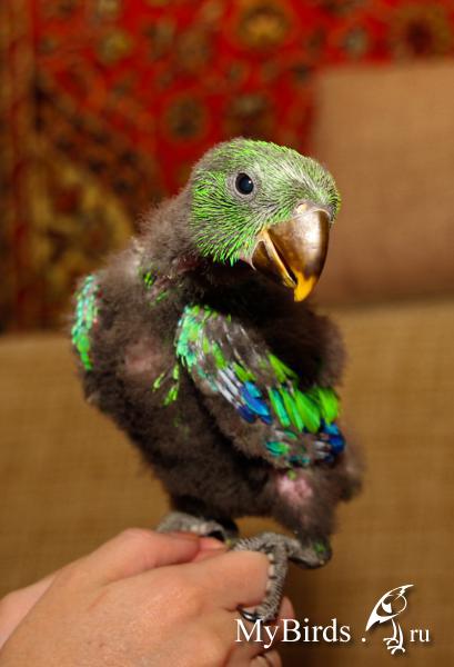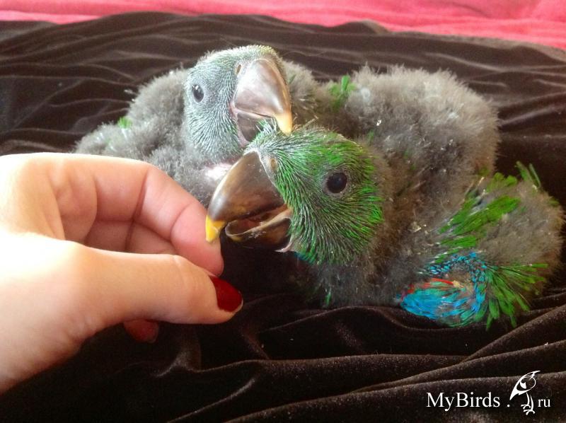 Lamiya Опубликовано 19 мая, 2013 Автор #42 Опубликовано 19 мая, 2013 fanka, Спасибо за добрые слова =)Да крылья у нас действительно такого цвета, причем у старшего птенчика более ярко выражен этот бирюзовый цвет и с плеч заходит аж на спину. Теперь немного про деток На днях нам исполнилось два месяца. Мы уже почти взрослые, Перья растут очень быстро. Из брудера уже переселились в клетку, гуляем, изучаем новые игрушки и пробуем разную еду. Как и все подрастающие эклектусята, мы стали воевать со шприцом, в итоге все как поросята вымазываемся в каше. Воюем мы кстати не только с едой, мы швыряемся на всех и на все что нам не знакомо, сначала бросаемся, а потом смотрим на кого. Порой и мне достается, но как только слышат мой голос, сразу узнают и начинают звать. Зовут нас кстати Шмыга и Пивз =)Думаю все догадались кто из них Шмыга Все же характеры у деток сильно отличаются, собственно как и размеры, даже голоса разные! Пивз, очень спокойный и не торопливый ребенок, тихий, даже когда я прихожу кормить, он так тихо и не навязчиво просит, что его еле слышно. На шприц кстати не швыряется, в отличие от брата. Еще он заметно крупнее, голова более массивная и клюв ярче. Мне даже кажется что он крупнее чем Вжик. Шмыга как был шилопопым так и остается им. Очень звонкий ребенок, сразу откликается на голос, вечно попрошайничает, когда наестся сразу объявляет шприцу войну! При этом сначала прикидывается голодным (клянчит, типа кормите его), но только шприц оказывается рядом с ним, как он сразу на него кидается, при этом весь распушится как шар, чтобы казаться больше и страшнее. Вообще не в обиду Пивзу, Шмыга кажется более смышленым ребенком, он быстрее осваивает все новое, активнее реагирует на происходящее радом. В общем, соскучится не даст.