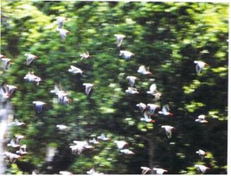 Где-то до 10 часов сотни птиц слетали на землю, предположительно за насыщенной солями почвой и растениями. У меня создалось впечатление, что к стае, копошащейся на земле, время от времени присоединялись новые группы птиц. С другой стороны некоторые птицы взлетали, чтобы приземлиться на стоящих поблизости деревьях. Так продолжался своеобразный спектакль, к которому присоединялись, предположительно, всё новые и новые птицы издалека, теперь стая насчитывала около 600 серых попугаев.»