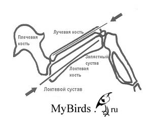 Относительно частые переломы лучевой кости, которые при отсутствии лечения могут привести к ограниченной возможности полета, скрепляются с помощью 0,4 мм канюли, вставляемой в дистальный конец перелома. Канюля выходит через головку лучевой кости, определяемой пальпацией в плечевом суставе, и проталкивается в обратном направлении в проксимальный конец перелома до тех пор, пока не окажется прямо перед локтевым суставом. Спица, выходящая из плечевого сустава, должна на 1-2 мм выходить из кожи; конец спицы необходимо закрыть небольшим кусочком пластыря, чтобы пациент не смог ее вытянуть.