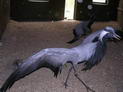 Два серых журавля сами пришли в Питомник. Одна из них взрослая самка была отловлена возле вольеры овдовевшего самца, на чей зов регулярно прилетала в течение месяца. Вторая молодая птица с множественными неправильно сросшимися переломами крыльев пришла на голоса журавлей Питомника осенью и тем избежала верной гибели.